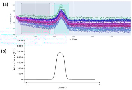 Simultaneously acquired UV chromatograph (b) and e-nose sensorgram (a) at the outlet of the split eluent with 10% α-pinene outgoing from SFC. In (a), each color represents the signal from one of the biosensors.