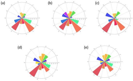 Radar chart at the outlet of the split eluent with 10%: (a) α-pinene, (b) R-limonene, (c) S-limonene, (d,e) citral. In figures, each color represents a biosensors.