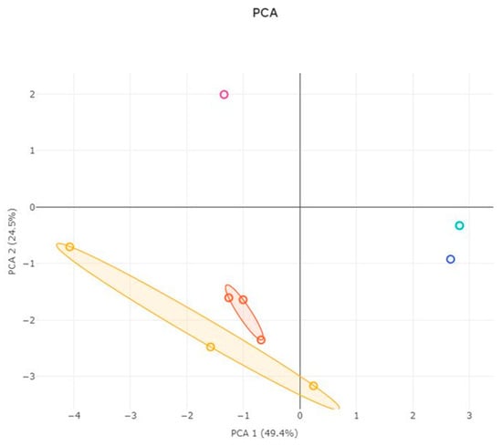 Principal component analysis of signatures obtained with the measurement of 4 different VOC: R-limonene (purple), S-limonene (blue), α-pinene (orange), citral isomer 2 (cyan), and α-pinene in essential oil of lemon (yellow).