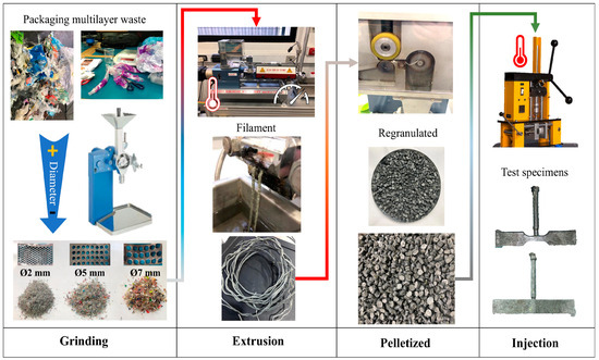 Using the obtained pelletized material, specimens were fabricated following the ASTM D638-14 [53] and ASTM D790-17 [54] standards, for tensile and flexural tests, respectively. The injection molding procedure was carried out using a CR 25 Clarke manual injection molding machine (CR Clarke & Co Limited, Ammanford, UK), with the pelletized material loaded into the injection chamber at 210 °C (only for the extrusion combination T°l) and 245 °C (for the extrusion combinations T°m and T°h). Then, manual pressure was applied, and the molten material was injected into the matrices (at room temperature) of both types of specimens. Subsequently, metrological control was carried out on all samples. The experimental mechanical recycling work mentioned is summarized in Figure 1.