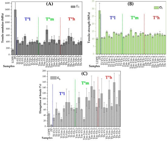 The tensile testing was carried out until specimen fracture, and the highest and lowest elongations at break (εb) were determined for the granulometry of Ø2 (as shown in Figure 2C). Keep in mind that the εb values for the Ø2 sieve were low only in three studied combinations. Note that for Ø2 and Vh combined with T°l, T°m and T°h, εb increased gradually in the same order, showing the two highest values at 159.1% and 144.9%. Most of the values fluctuated around 83% of the maximum value, indicating high material variability. None of the values corresponded to deformations smaller than that of PP, and approximately 90% of the samples had values higher than that of LDPE.