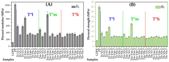 The values of the flexural elastic modulus (Ef) are shown in Figure 3A, where the highest value was found for PP, corresponding to 1233.1 MPa, and the lowest for LDPE, corresponding to 119.7 MPa. Similarly, the Ø2 granulometry was characterized by two peaks of 942.5 MPa (approximately 21% higher than that for tension) and 843.1 MPa.