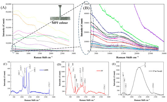 Raman spectra for (A) all samples, (B) amplitude zoom, (C) LDPE sample, (D) PP sample and (E) Ø2 sample.