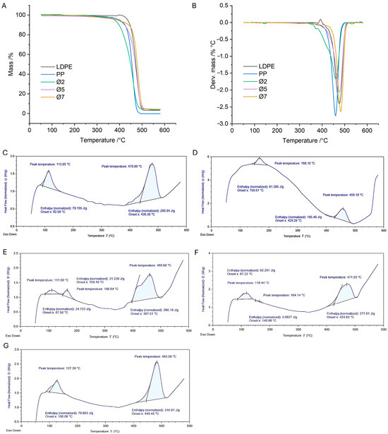 (A) TG curves, (B) DTG curves; DSC thermogram for (C) LDPE, (D) PP, (E) T°m-Vm-Ø2, (F) T°m-Vm-Ø5, (G) T°m-Vm-Ø7.