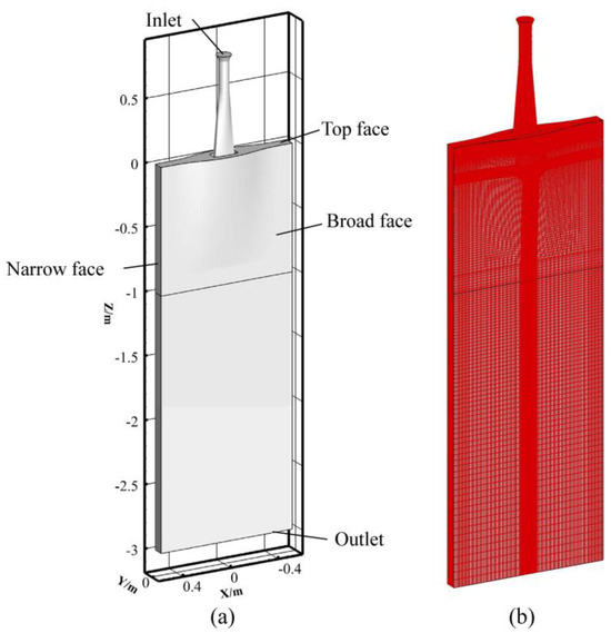 Subsequently, the obtained electromagnetic data are loaded into ANSYS Fluent 16.0 (Pittsburgh, PA, USA) by the MHD model for the further calculation of the flow, heat transfer, and solidification behavior of liquid steel; the geometry structure and mesh of the fluid model used in Fluent are shown in Figure 2. To ensure the full development of the flow field and avoid the disturbance of backflow on the calculations, the total length of the mold is extended to 3000 mm. The computational domain is discretized using hexahedral structured meshes. For regions like the nozzle and meniscus, the mesh is refined. While, for the extended region of the mold where the velocity changes are weak, the mesh is adjusted to be coarse to reduce computational load. The total number of grids, verified for grid independence, reaches 1.5 million. Table 2 lists the main process parameters and physical properties of the liquid steel as used in the calculation of the fluid.