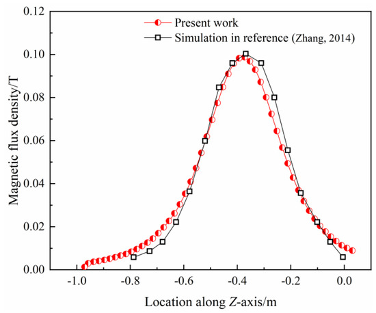 Due to the difficulty in industrial measurements of the magnetic field distribution inside the on-site mold, a model with similar process parameters to the current study, as specified in reference [20], was selected to re-model and calculate the magnetic field for validation. The mold size is 1100 mm × 70 mm, and the EMBr device is located 400 mm below the meniscus. When the MMF is 10,000 a·n, the obtained distribution of magnetic flux density along the vertical direction of the mold is used to compare with the data in reference [20], as shown in Figure 3. It can be observed that the calculated result in the current study is similar to that in the reference, which indicates that the numerical simulation for the electromagnetic field is relatively accurate. In addition, the solidified shell thickness at the mold exit calculated in this paper is in the range of 11~15 mm, which is similar to the measured range of 12~15 mm in actual industrial production. It can be concluded that the solidification model and heat transfer boundary condition of the mathematical model in this article are relatively reliable.