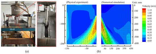 To verify the flow field, a physical experiment test system with a model-to-scale ratio of 1:3 was established. Mercury, a low-melting-point liquid metal, was used to simulate the liquid steel, and an Ultrasonic Doppler Velocimeter (DOP-2000, Signal Processing S.A. Co., Switzerland) was employed to measure the velocity of the liquid metal in the mold. Based on the similarity principle, the similarity ratios of the magnetic field intensity and the liquid flow rate were obtained [31]. Figure 4a shows the actual device in the physical experiment, and Figure 4b presents a comparison between the flow fields in the mold in the physical experiment and numerical simulation under the conditions of a casting speed of 4.5 m/min, a magnetic field intensity of 0.2 T, and a mold thickness of 87 mm. It can be seen that under this condition, an effective upward return flow can be formed in the mold. The velocity distribution obtained from the numerical simulation is basically consistent with that from the physical experiment, and the existing differences are related to the consideration of the solidification in the numerical simulation. It can be concluded that the model is relatively reliable in the calculation of the flow field.