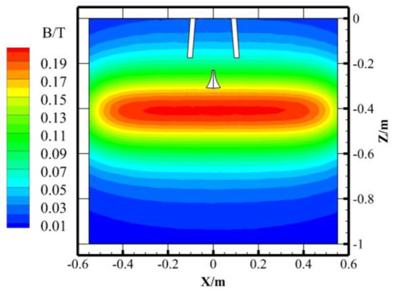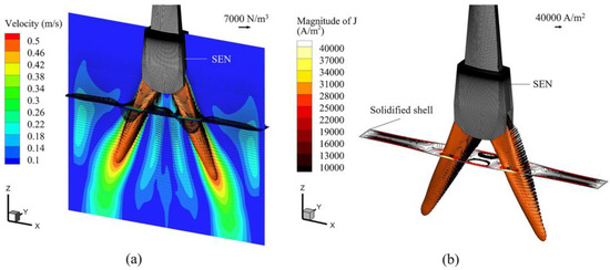 Figure 7a indicates that under the action of a static magnetic field along the positive y-axis, the main direction of the induced current generated by the jets is towards the positive x-axis. Multiple pairs of induced current loops are formed in the horizontal section, two pairs of which are in the mid-region between the jets and broad faces. These induced current loops have a maximum value of 40,000 A/m2 in the solidified shell. This phenomenon was also validated in Wang’s research [21].