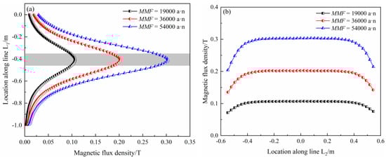 Distribution of magnetic flux density at different MMF values: (a) along height direction; (b) along horizontal direction.