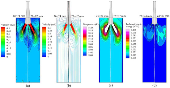 Figure 8a–d shows the velocity contour, streamline, temperature contour, and turbulence kinetic energy contour of the liquid steel in the mold when the casting speed is 4.5 m/min, Bmax is 0.2 T, and the thickness of the mold (Th) is 74 and 87 mm.