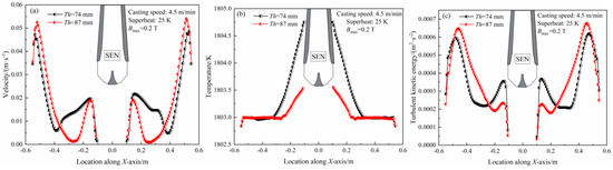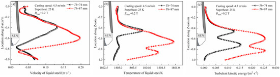 Figure 8 shows that when the mold thickness increases from 74 mm to 87 mm, the liquid steel is still in a double roll flow pattern. A larger thickness means a larger steel throughput in the mold, resulting in a larger jet velocity, and the penetration depth of the jet increases from 1.12 m to 1.35 m below the meniscus, as shown in Figure 8a, which hinders the flotation of non-metallic inclusions. It can be demonstrated that even under the braking effect of the EMBr, the impact of increasing mold thickness on the metallurgical behavior of liquid steel is considerable. Specifically, the upward flow has a higher velocity, and the center of the recirculation flow moves downwards, as shown in Figure 8b. In addition, the temperature in the mold upper region decreases with the increase of mold thickness, especially in the area near the SEN. Overall, the high-temperature penetration zone also moves downwards, as shown in Figure 8c, which will increase the superheat at the solidification front and the proportion of columnar crystals. Furthermore, turbulent kinetic energy in the thicker mold becomes larger and concentrated in the lower part of the mold, as shown in Figure 8d.