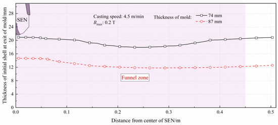 Figure 11 shows that the solidification shell is thickest near the nozzle center, where the flow is weaker and the steel renewal rate is slower, while it is thinner in the jet penetration region 0.2~0.3 m away from the nozzle. An obvious change in shell thickness is observed within the range of 0.05~0.15 m from the nozzle, indicating that this area is prone to significant stress concentration due to the non-uniformity of the shell thickness, making it a susceptible location for longitudinal cracks. Spatially, the uneven velocity distribution leads to significant variations in heat distribution in the mold. In the 74 mm-thickened mold, the smaller steel flow rate results in a thicker solidified shell. The maximum and minimum shell thicknesses along the broad face direction at the mold exit are 17.92 mm and 20.82 mm, respectively. The average shell thickness is 19.73 mm, with a non-uniformity coefficient λ of 15.23% and a standard deviation value of 1.09. However, when the mold thickness increases to 87 mm, the shell thickness thins, and the average thickness drops to 12.83 mm, with the non-uniformity coefficient λ increasing to 22.34% and the standard deviation value increasing to 1.10.
