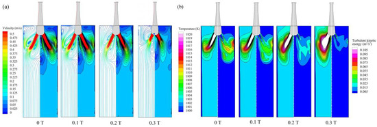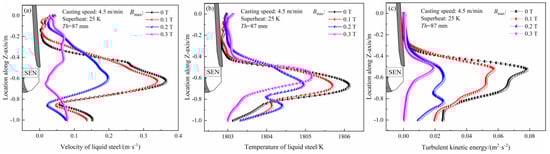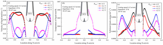 When the casting speed is 4.5 m/min, Bmax is 0, 0.1, 0.2, and 0.3 T; the velocity contour and streamline are shown in Figure 12a, and the temperature and turbulence kinetic energy are shown in Figure 12b. The distributions of velocity, temperature, and turbulence kinetic energy near the narrow faces and meniscus in the molds with different electromagnetic intensity are shown in Figure 13 and Figure 14, respectively.