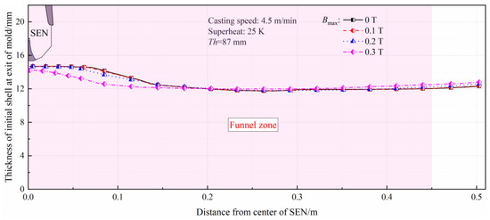 It can be observed that when Bmax is 0 T, the solidified shell thickness ranges from 11.76 to 14.69 mm, and the average thickness is 12.86 mm, with a non-uniformity coefficient of 22.85% and a standard deviation value of 1.17. When the EMBr is applied, the shell thickness decreases near the nozzle and increases at the broad face center and near the narrow face. The maximum thickness decreases, and the minimum thickness increases. As the Bmax increases to 0.1 T, 0.2 T, and 0.3 T, the average thickness of the solidified shell decreases to 12.84 mm, 12.83 mm, and 12.62 mm, and the non-uniformity coefficient decreases to 22.84%, 22.34%, and 17.94%, respectively. The lowest standard deviation value is 0.71 when the Bmax is 0.3 T. It is evident that EMBr improves the thickness uniformity of the solidified shell by altering the metallurgical behavior of liquid steel in the mold.
