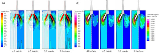 Effect of casting speed on metallurgical behavior of liquid steel in mold: (a) velocity streamline and contour; (b) temperature and turbulence kinetic energy contour.