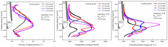 Metallurgical behavior of liquid steel near narrow faces in molds with different casting speed: (a) velocity; (b) temperature; (c) turbulence kinetic energy.
