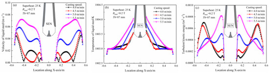 For a Bmax of 0.2 T and casting speed of 4.0 m/min, 4.5 m/min, 5.0 m/min, and 5.5 m/min, the velocity contour and streamline are shown in Figure 16a, and the temperature and turbulence kinetic energy are shown in Figure 16b. The distributions of velocity, temperature, and turbulence kinetic energy near the narrow faces and meniscus in the molds with different casting speeds are shown in Figure 17 and Figure 18, respectively.