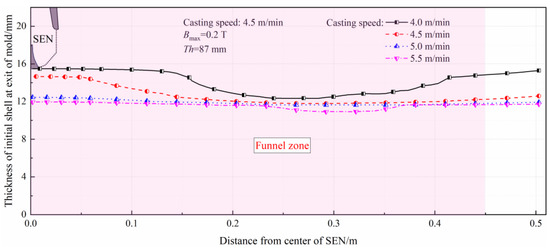 Thickness distribution of solidified shell along broad face direction at mold exit under different casting speed.