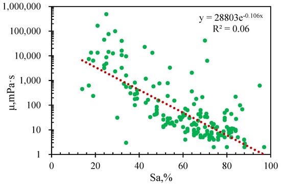 Published literature suggests that the chemical components influencing viscosity include saturates, aromatics, resins, and asphaltenes [36]. Figure 2 shows that viscosity decreases exponentially as saturate content increases. This is because saturates are nonpolar and consist of normal alkanes, branched alkanes, and cyclo-alkanes, which have a solvent effect on other components, leading to reduced viscosity. Furthermore, the analysis clearly showed that there was the same trend, and the viscosity, with the increment of API gravity, decreased faster than that caused by the increase of saturate content in Figure 2.