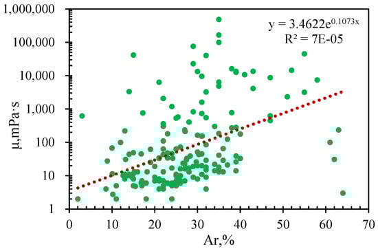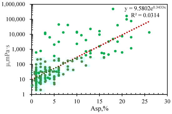 Both academia and oil companies are still actively researching the asphaltene deposition problem, and some studies have established a link between crude oil viscosity and asphaltene content [20]. Several experimental studies show that heavy oil viscosity is strongly influenced by the volume fractions, chemical structures, and physicochemical properties of its asphaltenes because asphaltenes are considered the heaviest and most polar components in crude oil [21,22]. As expected, viscosity increases significantly with asphaltene content due to strong attractions and aggregation between asphaltene particles at higher concentrations [23]. The conclusions are consistent with the conclusions of Mansour, especially for the extra-heavy or heavy crude oil.