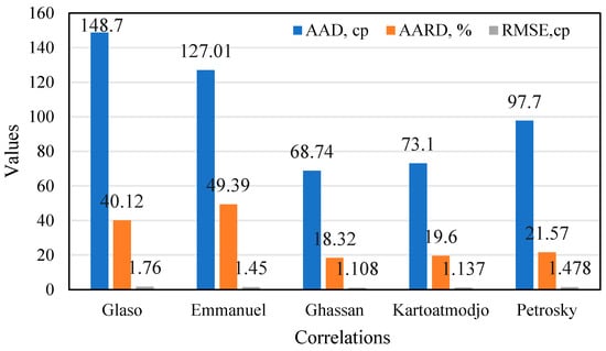 The performance of the correlations was compared by comparing measured and calculated viscosities. A detailed graphical and statistical error analysis was conducted to assess the viscosity results in Table 1. The viscosity prediction accuracy was evaluated using average absolute deviation (AAD), average absolute relative deviation (AARD), and relative mean square error (RMSE), calculated using the following equation [37].