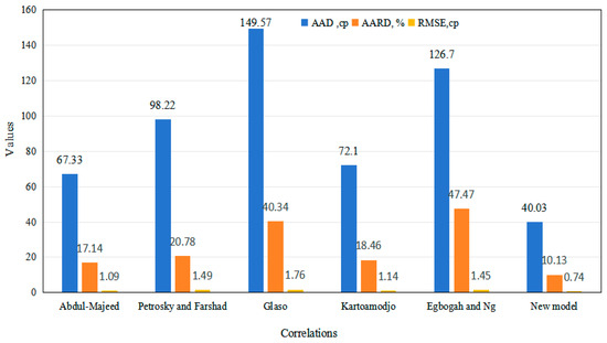Additionally, the AAD, AARD, and RMSE of empirical correlations from various studies were compared with the proposed model, as shown in Figure 13. The comparison results showed that the proposed model was superior to the empirical correlation of crude oil viscosity in the literature in terms of prediction accuracy.