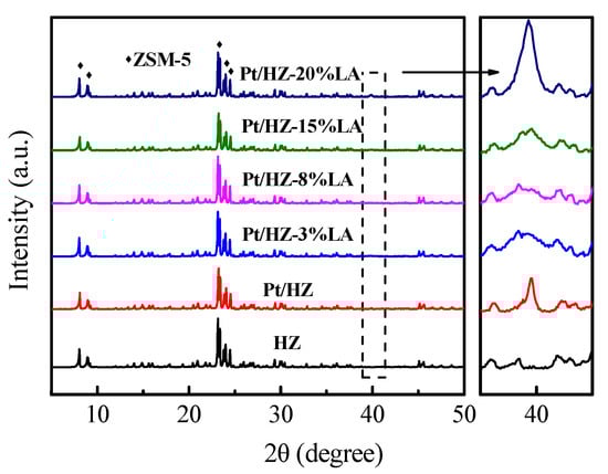 A Pt/HZ-x% LA catalyst was prepared through a wetness impregnation method, where the HZSM-5 zeolite was treated in a lactic acid solution, followed by centrifugation, and then it was impregnated into H2PtCl6 solution. X-ray diffraction (XRD) patterns of HZSM-5 (HZ) and the Pt/HZ-x% LA series (x = 0, 3, 8, 15, and 20) displayed typical peaks (2θ = 7.8°, 8.7°, 23.2°, 24°, and 24.4°) assignable to the MFI topology with negligible signals for impurities, indicating that the pre-treatment with LA did not disturb the original crystalline structure of MFI (Figure 1) []. Compared with the simple HZSM-5 zeolite-supported Pt catalyst (Pt/HZ), the almost disappearance of the sharp diffraction peaks for the metallic Pt0 (2θ = 40°) between Pt/HZ-3% LA and Pt/HZ-8% LA demonstrated the increased metal dispersion, which implied the effectiveness of LA in the pre-treatment of HZSM-5 []. Nevertheless, with the increase in LA content, obvious traces of characteristic peaks to metallic platinum gradually appear (Pt/HZ-15% LA and Pt/HZ-20% LA).