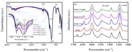 (a) FT-IR spectra of the HZ sample and the series of Pt/HZ-x% LA catalysts, along with magnified range from 3200 cm−1 to 3900 cm−1 at room temperature and (b) IR spectra of pyridine adsorbed on the HZ sample and the series of Pt/HZ-x% LA catalysts at 200 °C.