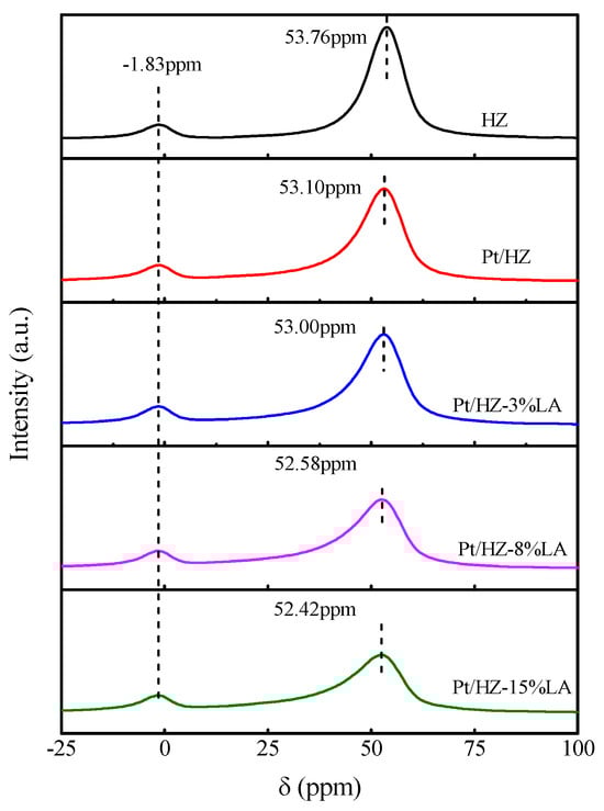 To clarify the changes in the microenvironment of Al atoms, 27Al MAS NMR analysis of the Pt/HZ-x% LA series was carried out by comparison with the initial support HZSM-5 (Figure 3). All the samples exhibited two chemical shifts around 55 ppm and 0 ppm, representing the tetrahedral-coordinated Al (T-Al) species and extra-framework octahedral-coordinated Al species (O-Al) in the zeolite framework, respectively [,,]. It could be obviously observed that, with the increase in LA treatment capacity, the intensity of T-Al signal was decreasing along with the trend of moving to the position of O-Al. The shift in T-Al peak position is probably related to the change in Al coordination structure. This indicates that the addition of LA more or less causes the shedding of a small number of framework Al species followed by in situ redispersion.