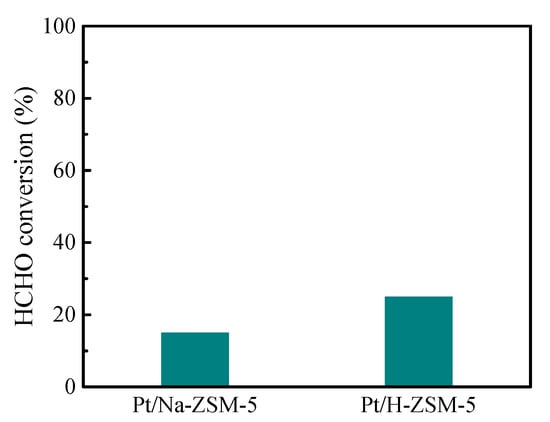 A comparison of the catalytic performance for the oxidation of HCHO over Pt/Na-ZSM-5 and Pt/H-ZSM-5 (the data were collected after 5 h). Reaction conditions: room temperature of 25 °C, HCHO concentration of 80 ppm, O2 20%, flow rate of 300 mL/min, Space Velocity (SV) of 360,000 mL/g/h, Relative Humidity (RH) = 10%, and N2 as the balance gas.