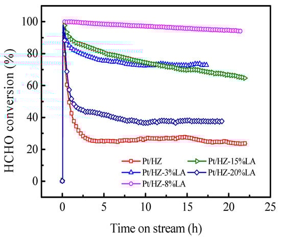 Accordingly, the HZSM-5 support was modified with different amounts of LA (HZ-x% LA), and a series of HZ-x% LA-supported Pt catalysts (Pt/HZ-x% LA) were further systematically evaluated for this reaction (Figure 5). Pt/HZ-3% LA displayed much higher HCHO conversion in comparison to the Pt/HZ at 20 h, almost triple the previous maximum (75% vs. 25%). With the initial LA loading increasing to 8%, a nearly complete conversion of formaldehyde was observed over the Pt/HZ-8% LA catalyst within 20 h. This representative performance gives potential application in the room-temperature removal of indoor formaldehyde in our daily life. Nevertheless, after a further increase in the amount of LA usage on the support, a negative performance in HCHO oxidation appeared, and only an average 65% and 40% conversion of formaldehyde was achieved in the presence of Pt/HZ-15% LA and Pt/HZ-20% LA, respectively. In addition, the influence of a different space velocity over the Pt/HZ-8% LA catalyst was evaluated by using humid HCHO + O2 + N2 flow gas (80 ppm HCHO, 20% O2, relative humidity (RH) = 10%) under the SV of 180,000 and 540,000 mL/g/h (Figure S4). Rapid and complete HCHO removal was observed under the SV of 180,000 mL/g/h and the activity was stably maintained within 20 h, which was better than the case of 360,000 mL/g/h. Further increasing the SV to 540,000 mL/g/h caused a continuous decline in HCHO conversion, but the removal ratio was still over 80% after 20 h. All of these visualize the superiority of Pt/HZ-8% LA in room temperature HCHO oxidation, which is especially suitable for the situation of dramatic volatile SV, such as indoor air purification.