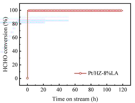 Moreover, a long-term activity test of HCHO oxidation was carried out to evaluate the stability of the idol catalyst (Pt/HZ-8% LA), which is more meaningful for practical application, especially for noble metal catalysts. When RH was adjusted to 60%, comparable to the humidity conditions of the real environment, the Pt/HZ-8% LA catalyst achieved the complete oxidation of HCHO at room temperature, and no obvious catalyst deactivation was observed within the tested 120 h (Figure 6).