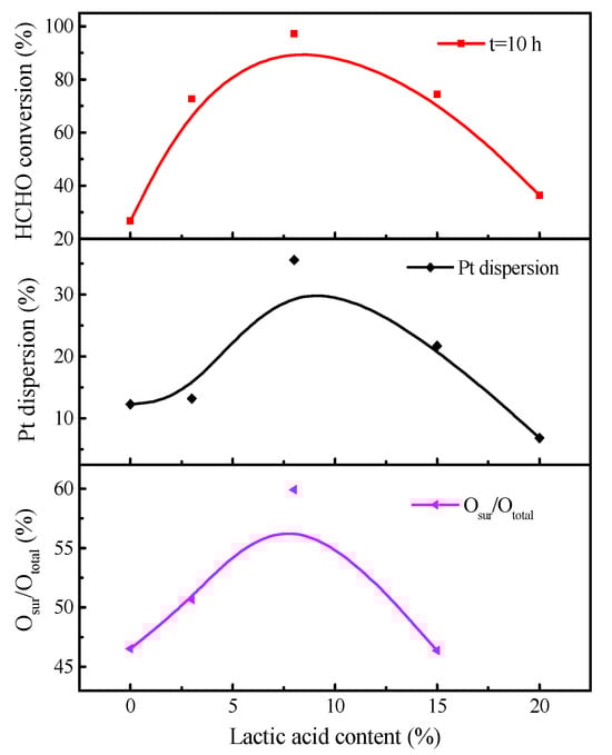 To understand the promotion effect of lactic acid as a modifier, we systematically investigated the relationship between HCHO conversion after 10 h on time of stream and Pt dispersion, Osur/OTotal, acidic sites, and other factors. Nevertheless, this feature is quite different from the results obtained from this zeolite-supported Pt catalyst system, where the replacement of sodium cation with protons displayed an enhanced activity. This phenomenon is most probably assignable to the increased activation ability of oxygenates via acidic sites. Figure 7 correlates the conversion of HCHO with the Pt dispersion and the Osur/OTotal. Overall, with the increase in lactic acid, the conversion of HCHO presented a tendency of volcanic type change, while at the same time contributing to the almost similar situation of that of Pt dispersion and the Osur/OTotal. The treatment with a low lactic acid concentration was able to present homogeneously inside the channels of ZSM-5 zeolite and had little influence on the morphology of the support, which was evidenced by the 27Al MAS NMR analysis. As a result, due to the interaction between the acid and aluminum, the species at unsaturated sites fell off, leading to additional hydroxyls. This information is well in line with that of the significant enhanced HCHO conversion (from 25% to 75%), where the platinum dispersion has only increased a little, demonstrating the indispensable role of hydroxyls. The satisfactory performance in HCHO oxidation resulted from the comprehensive cooperation between a high hydroxyls density (Osur/OTotal) and well-dispersed Pt nanoparticles, which are closely related to a moderate lactic acid usage. In contrast, hyper-concentrated lactic acid usually diffuses faster, resulting in not only a higher adsorption equilibrium value but also irreversible zeolite structural change. Therefore, the spatial constraint effect of lactic acid and more extra-framework octahedral-coordinated Al species brought decreased Pt dispersion and hydroxyls density, respectively. Even so, the supposed poorer distribution was still better than that of simple Pt/HZ and finally gave an HCHO conversion of 65%, indicating that the higher dispersion degree is beneficial for a larger oxygen adsorption capacity along with enhanced catalytic activity.
