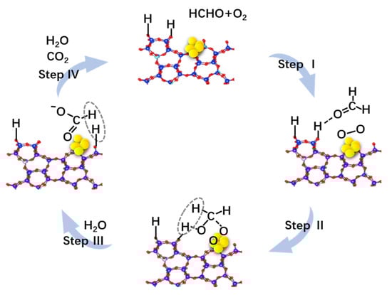 Based on the results above, the probable catalytic pathway for HCHO oxidation over the Pt/HZ-8% LA catalyst was put forward and proposed in Figure 8. Firstly, the molecule HCHO was adsorbed on the catalyst, which was assisted by the hydrogen bonding interaction with the surface hydroxy group (Step I). At the same time, oxygen molecules were active on the Pt NPs, giving two surface active oxygen atoms (Step I). Then, the intermediate was generated between the active oxygen atom and the adsorbed HCHO by the effect of electrophilic attacking (Step II). Subsequently, the intermediate reacted with the surface hydroxy group and transformed into the HCOO− species (Step III). Finally, the HCOO− species reacted with the surface hydroxy group and then decomposed into CO2 and H2O (Step IV). In general, this is the synergy between Pt NPs and the surface hydroxy group, as shown in Figure 7.