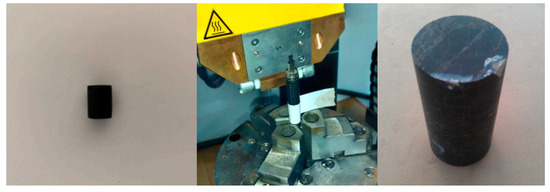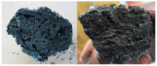 The lignite specimens were sourced from the No. 5 coal seam at the Yuanbaoshan open-pit coal mine located in Chifeng City, Inner Mongolia Autonomous Region, China. The samples were treated and polished to produce cylinders (Φ7 × 10 mm and Φ50 × 100 mm), with both ends ground flat. The lignite specimens are illustrated in Figure 1.
