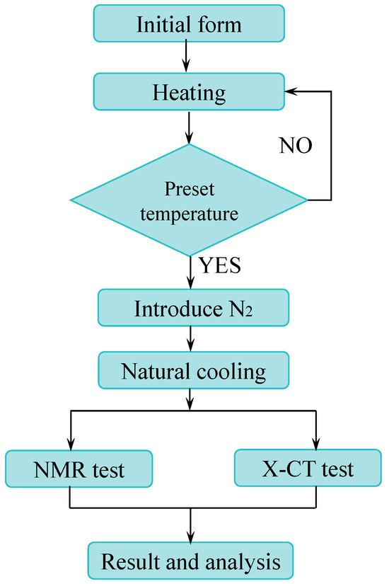 Lignite samples were initially analyzed using NMR at 25 °C, subsequently positioned on the reaction table, and heated to a predetermined temperature (150 °C, 250 °C, 350 °C, or 450 °C) at a rate of 10 °C/min. The temperature was maintained for one hour, and the samples were let to cool naturally under the protection of nitrogen gas. The naturally cooled samples were subsequently extracted and promptly sealed with wax, followed by testing the pertinent parameters using NMR. The specific process is shown in Figure 3.