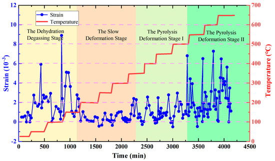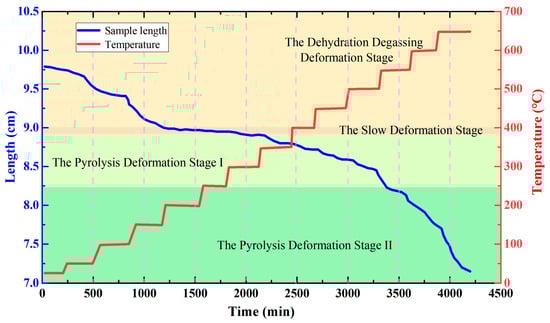 The lignite was heated from room temperature to 650 °C for 4116 min. The relationship curve between the length and strain of the lignite sample and time and temperature during the entire temperature change process was obtained, as shown in Figure 4 and Figure 5. The sample’s maximum heating temperature was 650 °C. The pyrolysis process was categorized into three stages based on the interplay of strain, temperature, and time. The process consisted of three stages: the initial stage involved heating from room temperature to 200 °C, the second stage entailed slow deformation from 200 °C to 300 °C, and the last stage was the pyrolysis deformation from 300 °C to 650 °C. The dial indication revealed variations in the sample’s axial length. The lignite sample was compressed from an initial length of 9.7896 cm to 7.1971 cm, resulting in an overall deformation of 2.5989 cm. The deformation ratio was 26.55 percent.