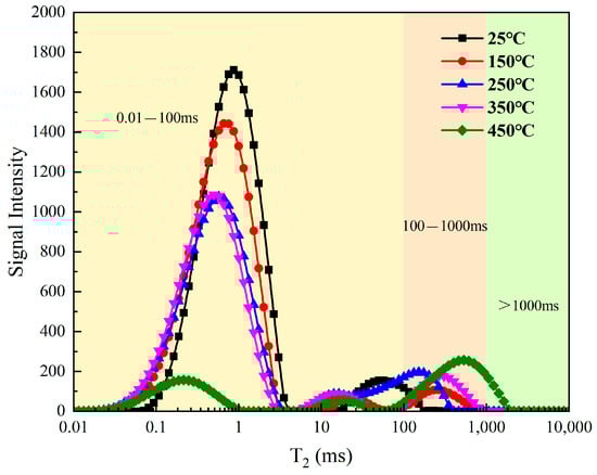 Figure 6 displays the T2 spectra of lignite subjected to various pretreatment temperatures, as acquired through NMR analysis. Significant disparities in signal intensity and T2 time are evident under varying temperature settings. The fundamental idea of NMR T2 spectral analysis of lignite pore fissures is that the lateral relaxation time of the 1H nuclei in the pore fissure water of lignite correlates with the pore radius. Consequently, an increase in pore size correlates with an extended relaxation time, and conversely.