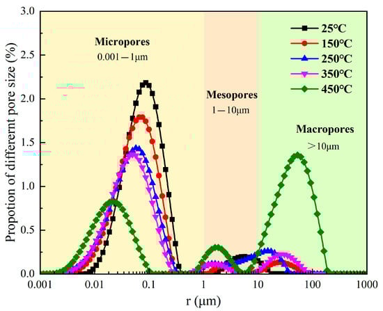 Based on the pore fracture features of lignite’s aperture distribution, the pore cracks in lignite can be classified into three size groups. Pores from 0.001 to 1 μm in diameter are classified as micropores, those measuring 1 to 10 μm are designated as mesopores, and those >10 μm are referred to as macropores or crevices [38]. Figure 8 illustrates a histogram depicting the pore dispersion across varying temperature settings. Figure 7 and Figure 8 illustrate that the lignite was predominantly characterized by small pores at room temperature (25 °C), comprising up to 93.34% of the total pore volume, with a minor presence of mesopores being seen. At a pretreatment temperature of 150 °C, significant cavities emerged in the lignite, although the quantity of mesopores was reduced compared to 25 °C. At pretreatment temperatures of 250 °C and 350 °C, although the pore fissures remain mostly characterized by micropores, the proportion of mesopores to macropores progressively rose. As the temperature increased to 450 °C, macropores supplanted micropores, becoming the predominant feature of the pore fissures in the lignite, constituting over 55%.