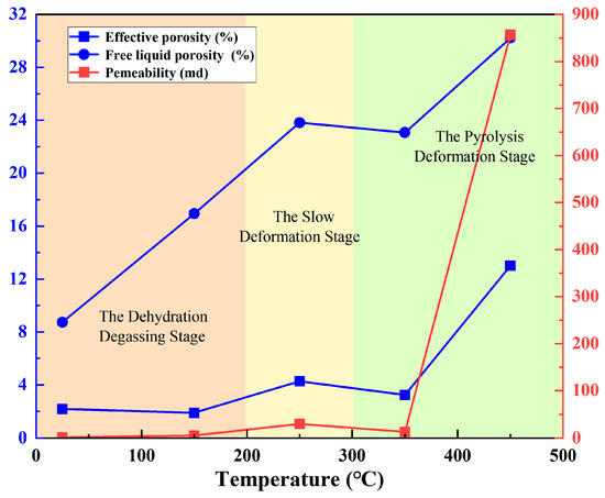 Within the temperature range of 200 °C to 300 °C, lignite dehydration is largely accomplished, and owing to the comparatively low temperature, lignite does not see significant pyrolysis reactions. The carboxyl group starts to decompose with warmth, although the reaction’s effect on the overall lignite structure is minimal, and the particle deformation in lignite results in its overall expansion. Consequently, the deformation of lignite is minimal, and its internal porosity nearly attains the maximum value, aligning with the permeability properties of lignite at elevated temperatures, specifically reaching a peak between the range of 250 °C to 300 °C.