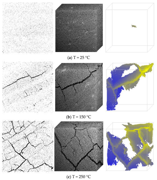 Scanning binary image (left), 3D reconstructed grayscale CT image (middle), and maximum pore cluster image (right) of lignite under different temperature treatments.