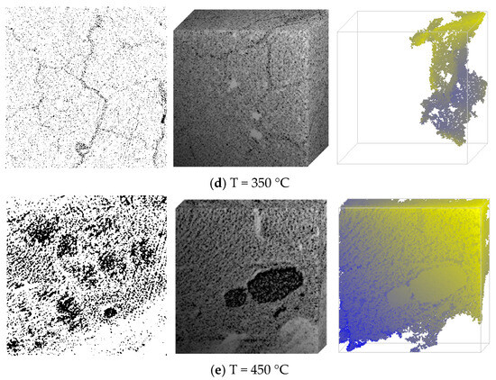 A two-dimensional image can be insightful and convey information regarding the evolutionary patterns of individual pores and fractures; nevertheless, it is limited in its ability to depict the geographical distribution of lignite pores and fractures. Consequently, a 3D reconstruction of the CT picture was executed. Figure 10 illustrates the three-dimensional reconstructed grayscale computed tomography images of lignite subjected to various temperature treatments, together with images of the biggest pore clusters.