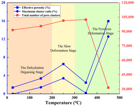 As the temperature rose, the porosity and the maximum cluster ratio initially increased, subsequently decreased, and then rose again. The total number of pore clusters initially rose and subsequently declined. At 25 °C, the maximum cluster ratio was 0%. Despite the comparatively high number of pore clusters at 25 °C, these clusters were predominantly tiny and poorly interconnected; hence, the percolation probability of lignite at this temperature was low. At 150 °C, the water and partially adsorbed gases (CO2, CH4, and N2) of the lignite were released, new pores and fractures were formed, the connectivity of pore clusters increased, the porosity of lignite was 3.38%, and the maximum cluster ratio was 1.43%. At 250 °C, the predominant pore cluster, created by the interlinking of smaller pore clusters, nearly encompassed the entire area, the porosity of lignite was 6.54%, and the maximum cluster ratio was 3.41%. As the temperature escalated, at 350 °C, the lignite entered the initial stage of pyrolysis and softened, producing and releasing several volatile gases and tar, which blocked the pores, and the porosity decreased by 4.09%. The porosity of the lignite was merely 2.45%, and the maximum cluster ratio was 0.185%. At 450 °C, the semi-coke generated from lignite pyrolysis underwent further heating and conversion into coke, leading to the release of significant quantities of gas, the pores and fractures within the lignite were effectively interconnected, and the density of coke escalated while the volume diminished. The maximum cluster ratio was 12.57%, and the porosity was 16.02%.