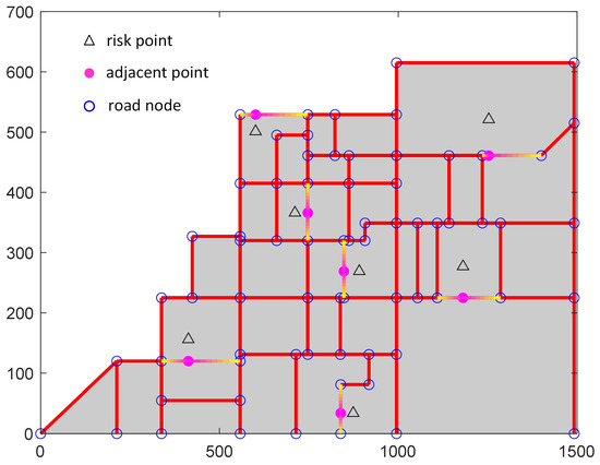 In this work, an inspection simulation model is used to simulate an actual chemical factory as shown in Figure 1. The model is built by reading the coordinate information stored in the document and connecting these coordinates according to the actual road distribution of the factory. In particular, the gray area is used to represent the work area of a chemical factory, which is an inaccessible area for robots and contains pipelines or reactors that are prone to gas leakage. The red lines represent the roads that connect the factory’s road nodes, and the robots can walk on these roads. Triangles are used to indicate the risk points where leaks occur. Since the risk point area is an area that the robot cannot reach, the point closest to the risk point on the road is selected and defined as an adjacent point. These adjacent points are then replaced with risk points to visit, and the robot can complete the inspection task by visiting these adjacent points. In addition, as the gas leaks into the air, the concentration of the contained gas varies at different distances from the risk point. From Equation (1), the closer to the risk point, the higher the gas concentration and the higher the gas sensitivity, and vice versa. So, the edges containing adjacent points are distinguished by different colors in Figure 1 compared to other edges. This distinction indicates that these edges can be used as effective detection edges for the robot. In addition, the depth of the color of the edge where the adjacent points are located indicates the concentration of the leaked gas after diffusion. In other words, a darker color indicates a higher concentration of leaking gas at these locations.