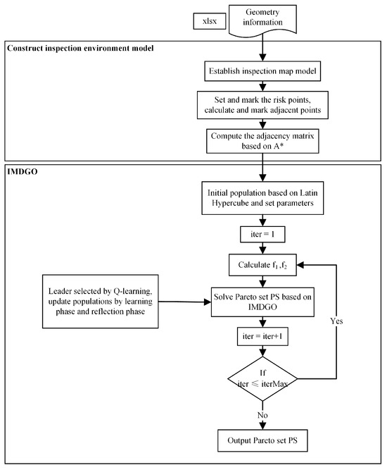 The chemical safety inspection path planning method is divided into two main stages. The first stage is the modeling stage. In this stage, the inspection environment model is established, the risk points are set, and then the adjacent points are calculated. The adjacent matrix is computed using A* as a parametric input to the multi-objective algorithm for solving the problem. The second stage is the algorithm solution stage that solves the model. The flowchart of the robot inspection path planning method is shown in Figure 2. The modeling is described in Section 2, and the solution algorithm improvement and process are described in detail in this section.