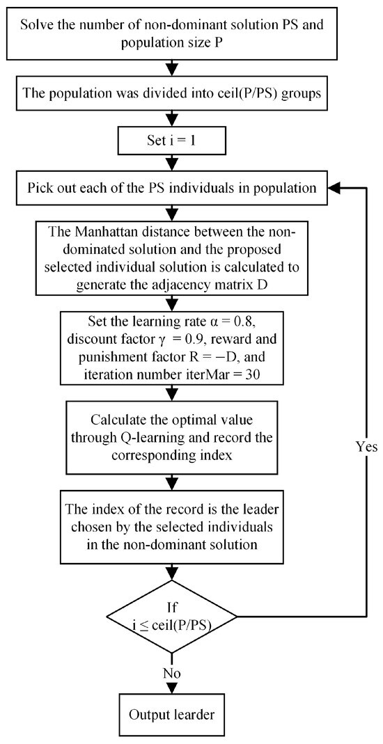 First, non-dominated solutions generated in the external archive are used as candidates for the leaders. Second, the population is divided into several groups, with the number of individuals in each group not exceeding the number of non-dominated solutions. Once several groups have been formed, the adjacent matrix is determined based on the Manhattan distance between the individuals in each group and the non-dominated solutions. Finally, the minimum sum of each group of distances is taken as the objective and solved using Q-learning. Find the correspondence between the individual and the non-dominated solution in the obtained final solution and use the non-dominated solution as the leader of the corresponding individual. The chart of the adaptive leader selection strategy is shown in Figure 4.