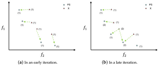 The advantages of this strategy are as follows: in early iterations, the number of non-dominated solutions is less than the number of individuals in the population, and the nearest non-dominated solution is selected as the leader for each group, which ensures that limited resources are utilized to the maximum, and increases the exploration ability of the algorithm. In later iterations, the number of non-dominated solutions is not less than the number of individuals in the population, the same individual can choose different leaders, and different individuals can choose the same leader, which ensures the exploitation ability of the algorithm and adds a certain exploration ability. The process of leader selection in different iteration periods is shown in Figure 5. The numbers in the brackets in the figure represent the number of corresponding solutions. Overall, the proposed adaptive leader selection strategy effectively balances the convergence and diversity of the population.