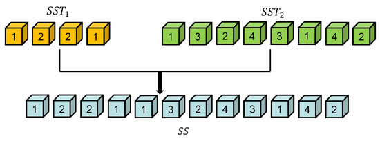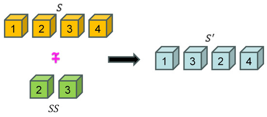 denotes an index of positions in the individual that might be swapped for a new individual from an individual by using . The probabilistic choice of is decisive for the computation of the new individual , whose discretization is shown in Equation (13). Firstly, a pair of index loops are selected from for individual updates according to Equation (10), where and . Continuous probabilistic selection for updating occurs in a loop until there are no index pairs available for updating. If the uniformly distributed random number in the range is less than , the individual is updated based on the index pair, whose update formula is shown in Equation (14) and Figure 9, and the update process is to swap the data point in the index pair corresponding to the old individual S. If not, update without the index pair.