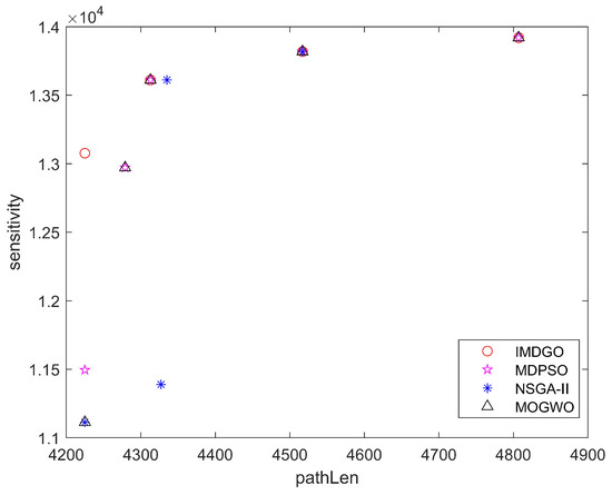 The Pareto Front is shown in Figure 10, which consists of the distribution of non-dominated solutions in objective space by different algorithms. The abscissa denotes path length, and the ordinate indicates detection sensitivity. it can be seen that the solutions obtained by IMDGO have a higher detection sensitivity at the same path length and a shorter path length at the same detection sensitivity. Therefore, IMDGO is superior to other algorithms in terms of the quality of solutions obtained for the problems presented in this work.