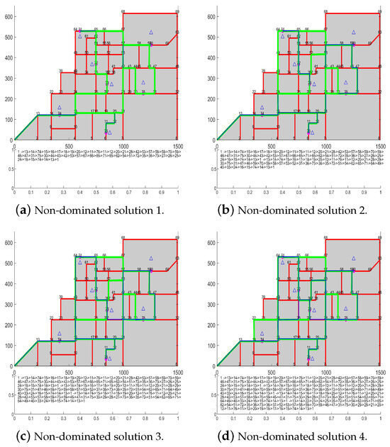 Table 3 provides all solutions calculated by IMDGO in Figure 10, and Figure 11 displays the robot inspection programs for these solutions. In Figure 11, the green lines indicate roads where the robot will only pass once, and the blue lines show roads where the robot can go through repeatedly. The sequence of robot inspection nodes is presented by the numbers below each figure, which shows the process of robot inspection. A set of several non-dominated solutions with different trade-offs are obtained by the presented chemical safety inspection path optimization method in this work. The robot inspection process path length is smaller when the detection sensitivity is also smaller; at this time, the robot inspection time is shorter, but the detection sensitivity may not necessarily reach the actual need. When the path length is large, the detection sensitivity is also large. However, despite the large detection sensitivity, the robot inspection process requires more time. In practice, the goal will determine which inspection program is best to choose.